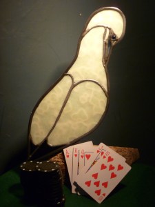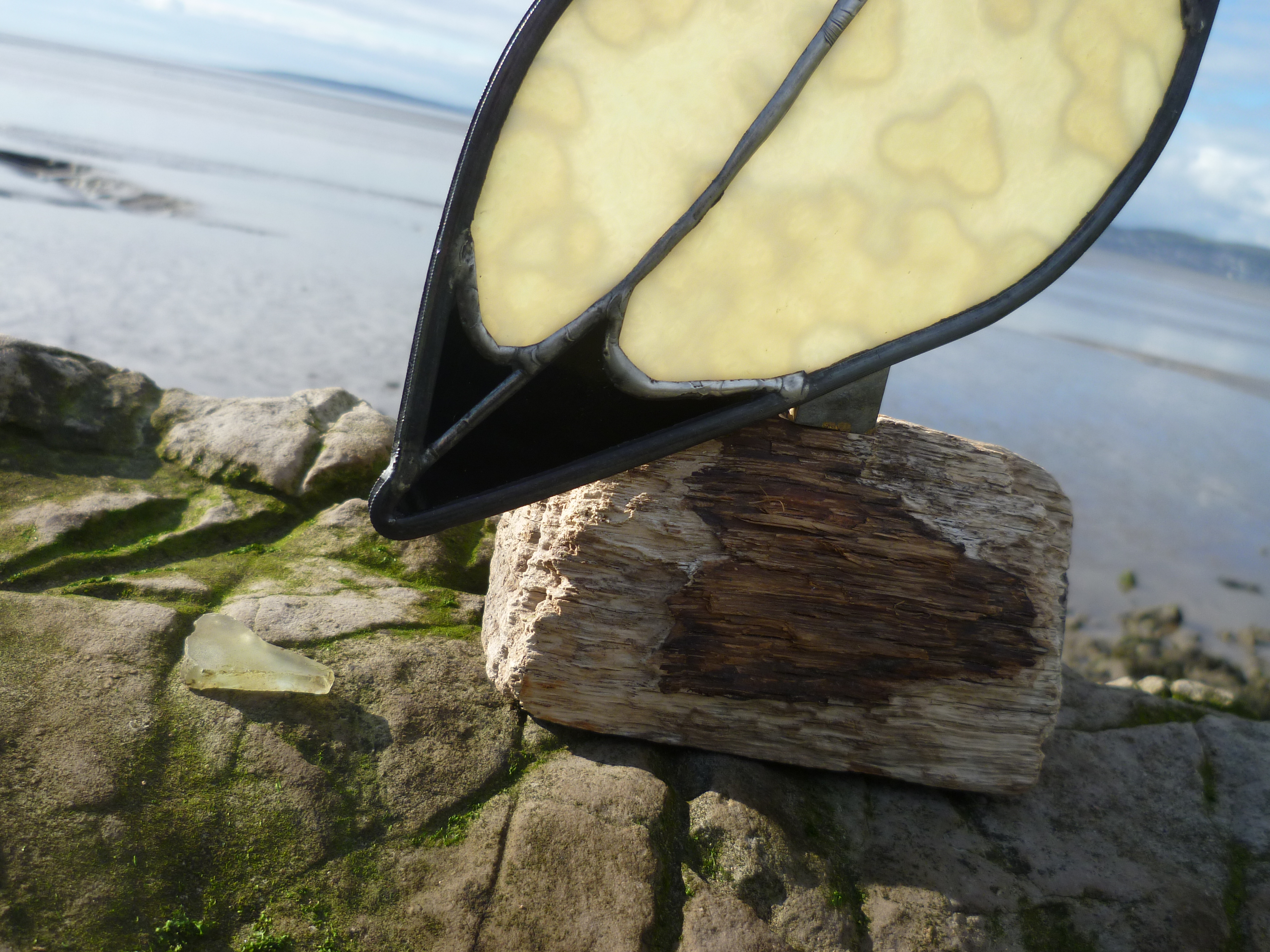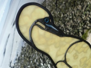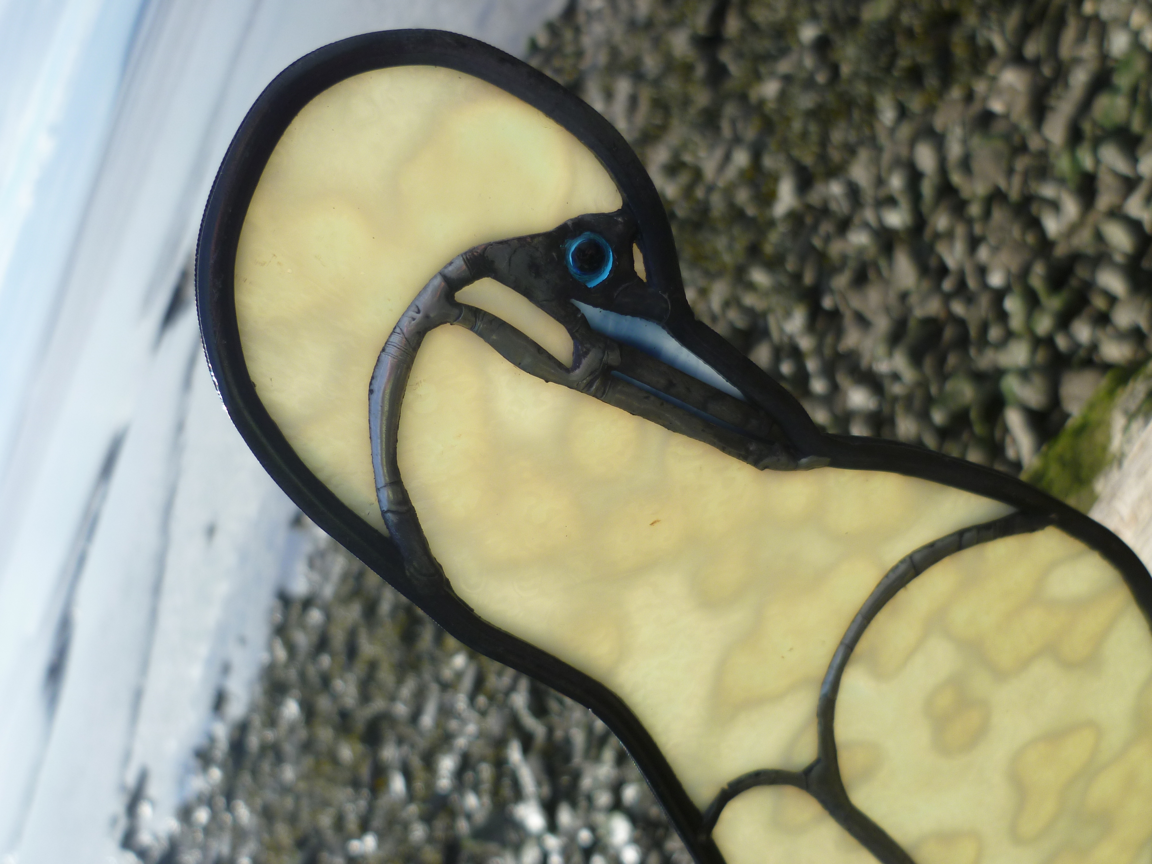 Phew, that was exciting. Now for those that are interested, the glass used for my gannet is a handmade ‘ring-mottled uroboros’; check out the lovely subtle colour variations. He is made with a combination of copper-foiling and leadwork and is mounted on a piece of driftwood.