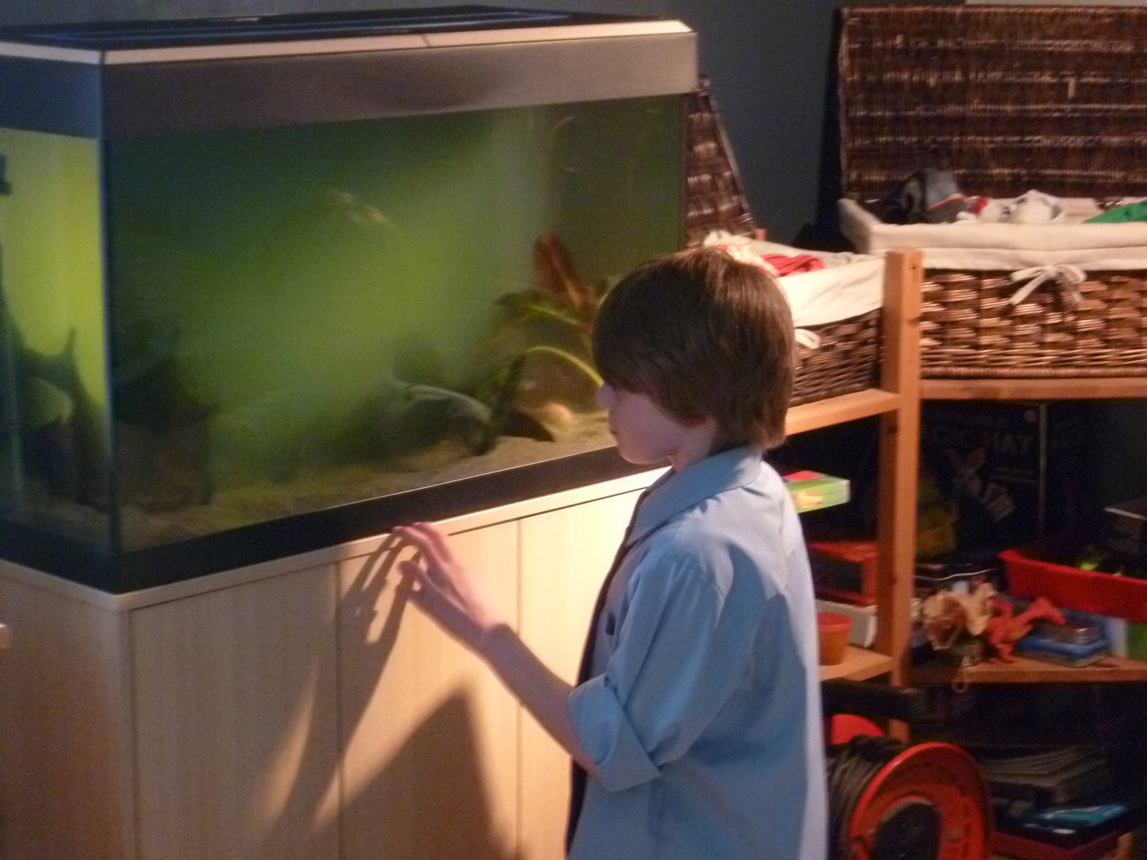 room, (thanks John!) Finn is thrilled to inherit “Dek the plec”, (who is quite enormous and very beautiful), and 3 little white catfish and 2 tetra’s. Check out ‘gobsmacked Finn’.