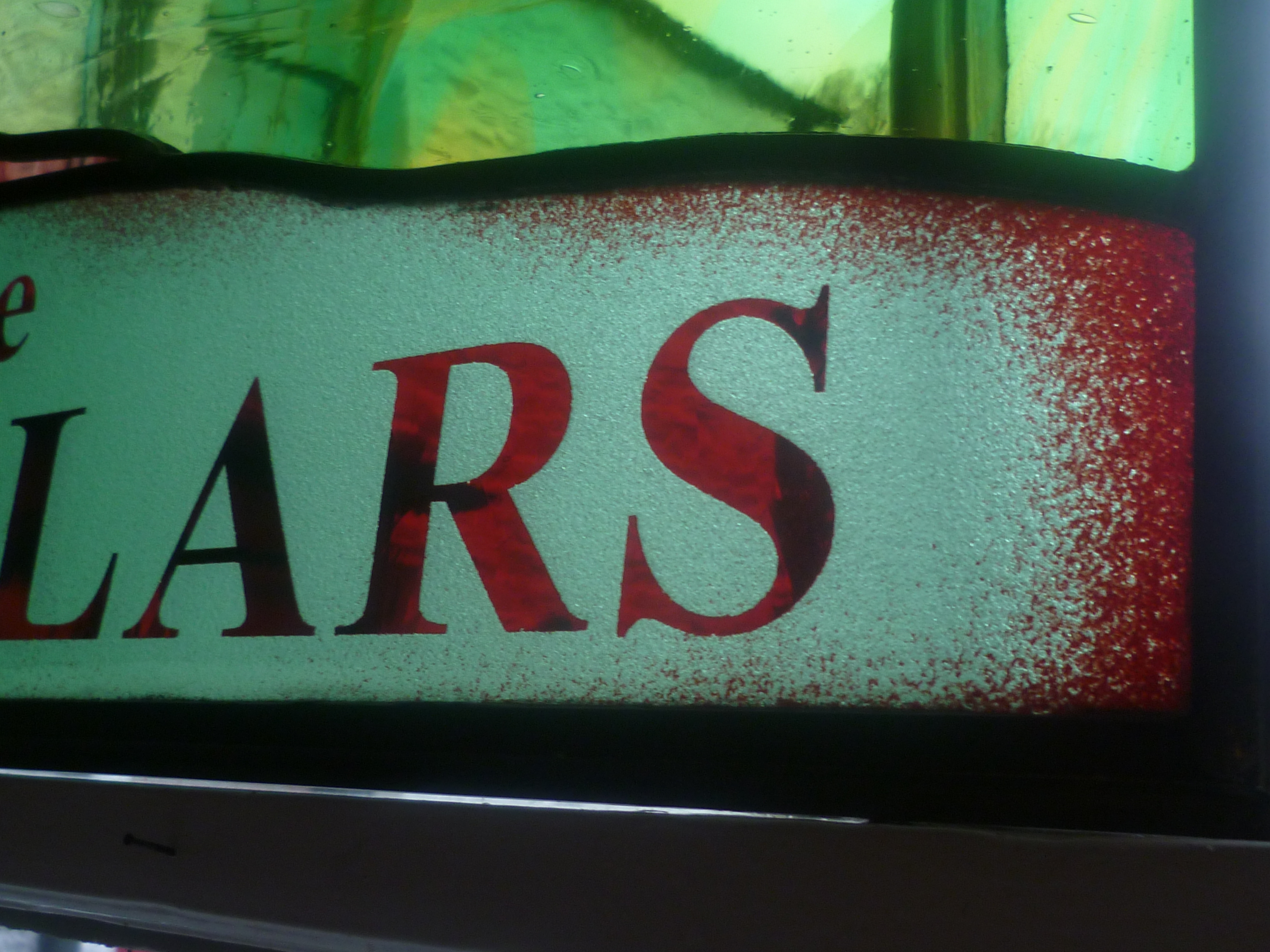 Then came the real exciting bit….time to have a ‘blast’! Mike and Helen wanted the name of their house incorporated in the panel. I had discarded leadwork as this would have been too fussy and would detract from the scene. I couldn’t paint as I had no kiln. Etching was the way to go – but disaster, my acid etch cream was so weak it couldnae’ remove the flash on the glass. It was either stronger acid and risk losing the flesh on my bones – or sandblasting! And my mate Peter came up with the idea of contacting memorial mason’s Ed Waller and Dean Mason, (honest, that is their names!) and that was the start of my ‘blast’!