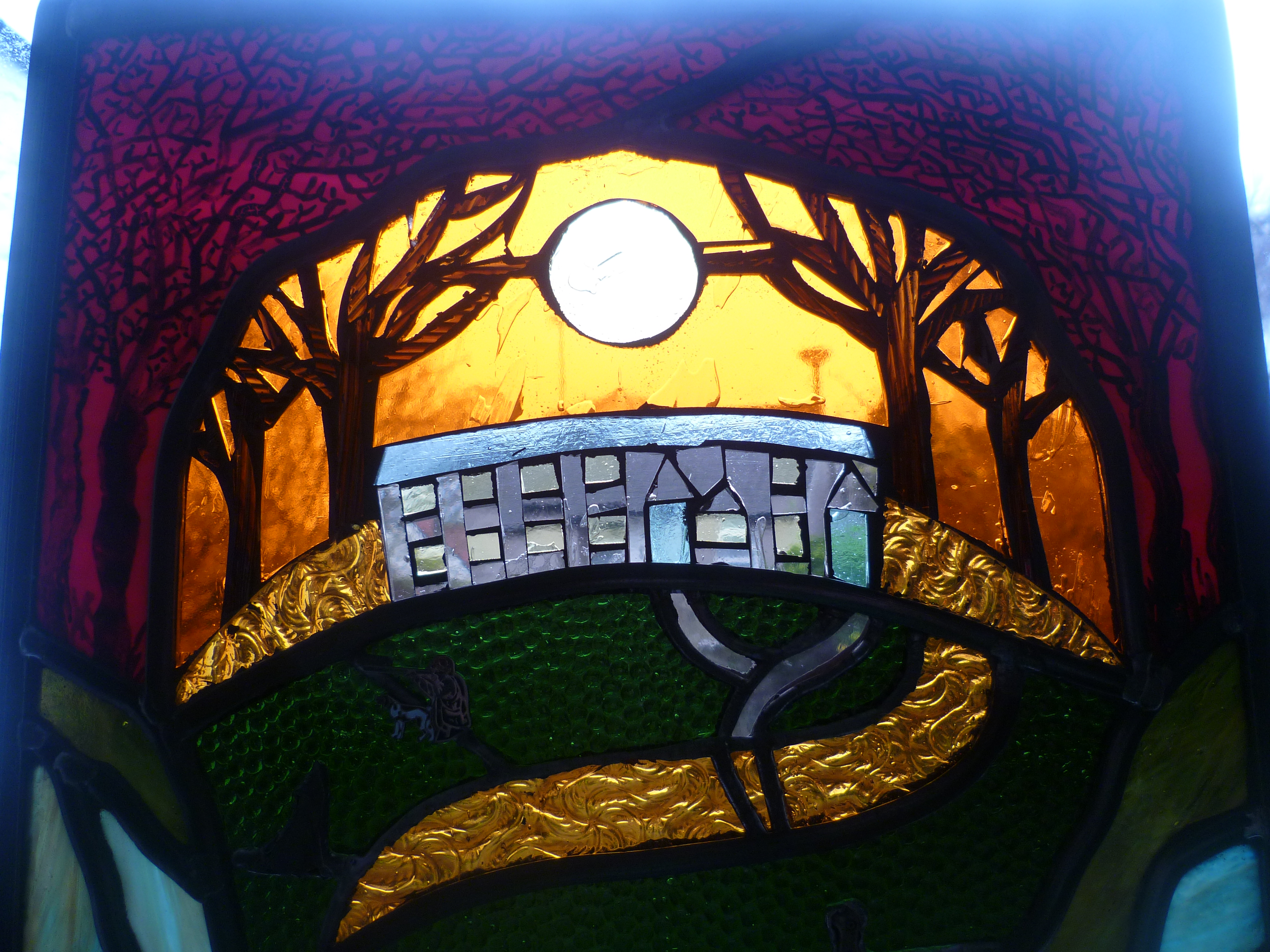 I then used every technique at my disposal to make it work. Glass applique was used for the intricate house section; copper-foiling to include the pottery and a beautiful sweep of copper beech hedgerow; then all pulled together with strong lead lines holding in the opaque framing.