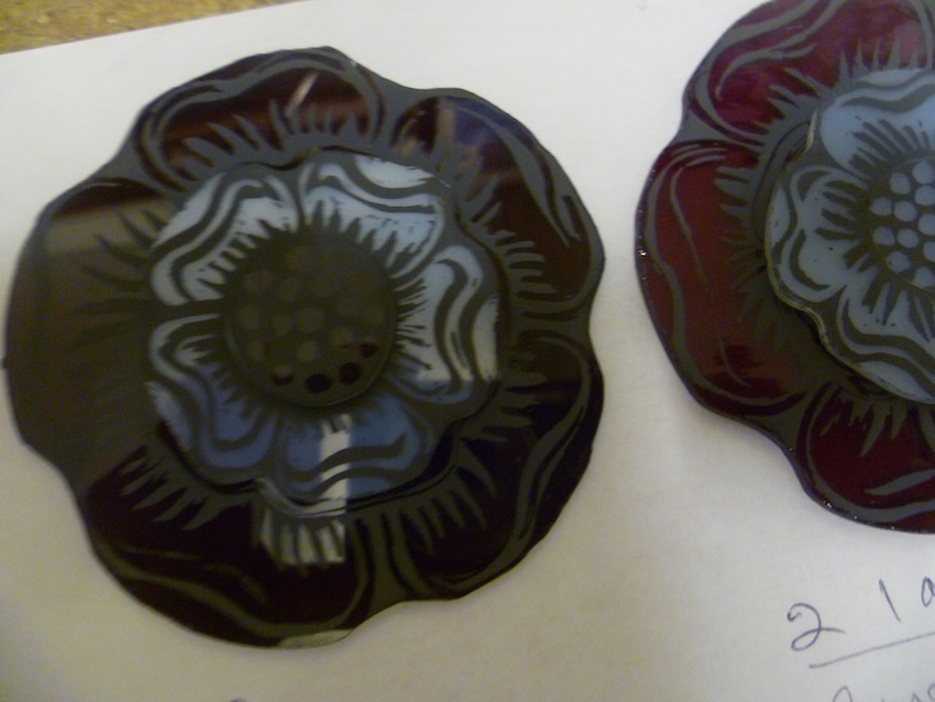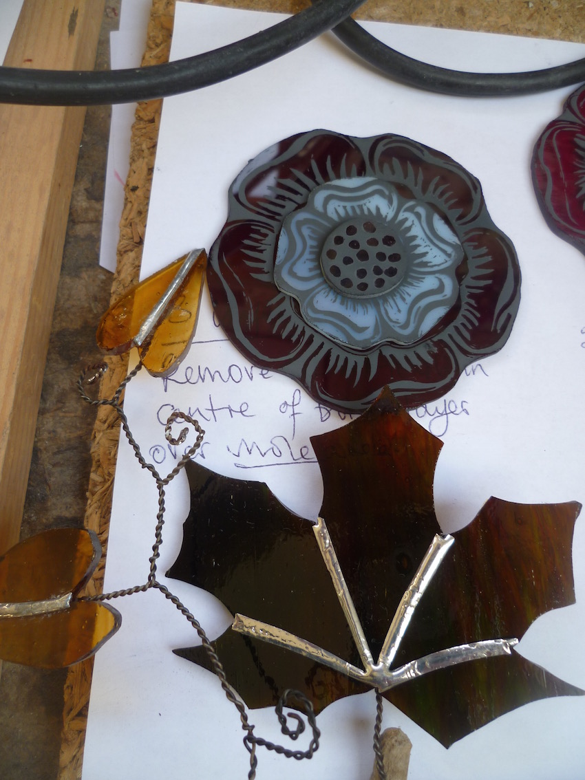 I used flasehd glass to make the Lancashire Rose, (which basically means I was able to remove the top red flash of glass using Barbara’s engraving tool to expose the clear glass beneath). Simples!!.? (Yeah right. I have a long way to go. Methinks Barbara might get sick of the sight of me.) Next on my wanted list could well be a wee dremell……..and ear plugs to accompany of course!