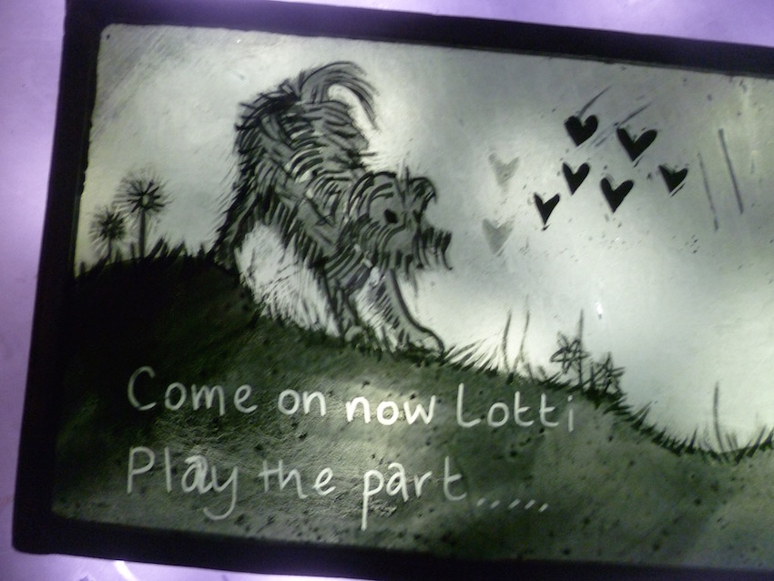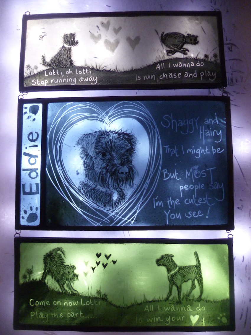 So with images lifted from Sal’s facebook page and a copy of ‘Hairy Maclairy’ I set to. Sue’s poem was edited to 6 lines. (She had got quite carried away and I had to remind her this wasn’t a Cathedral window we were creating!!) And I drew up the draft; a simple 3-piece panel with painted detail.