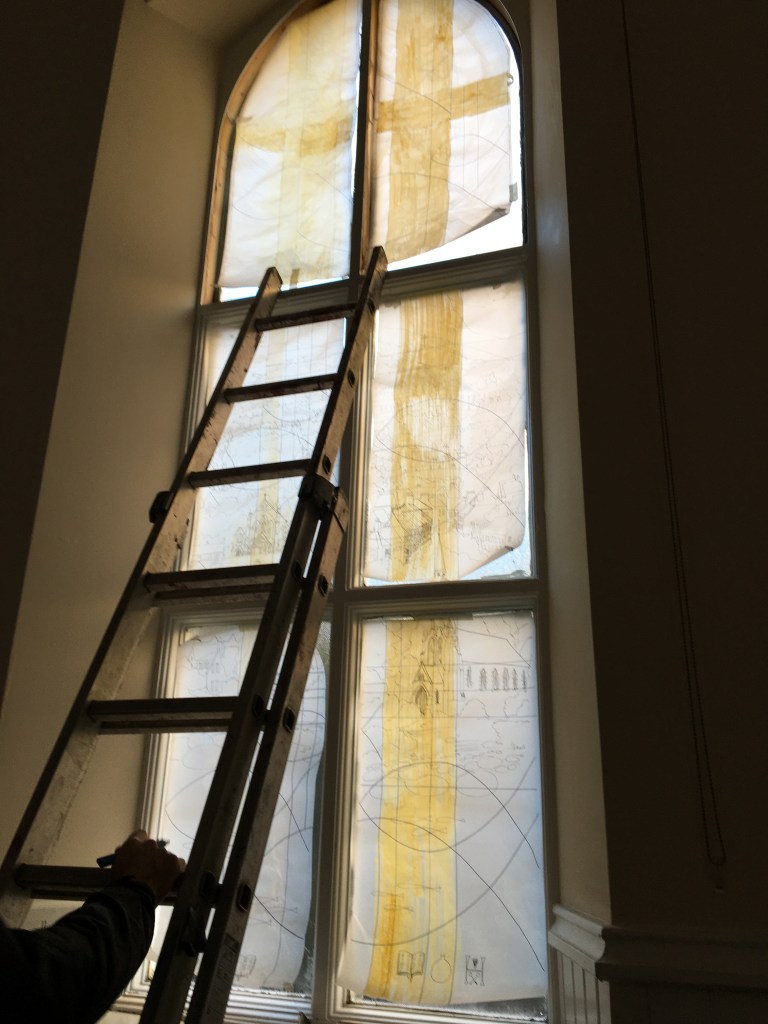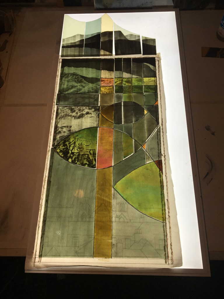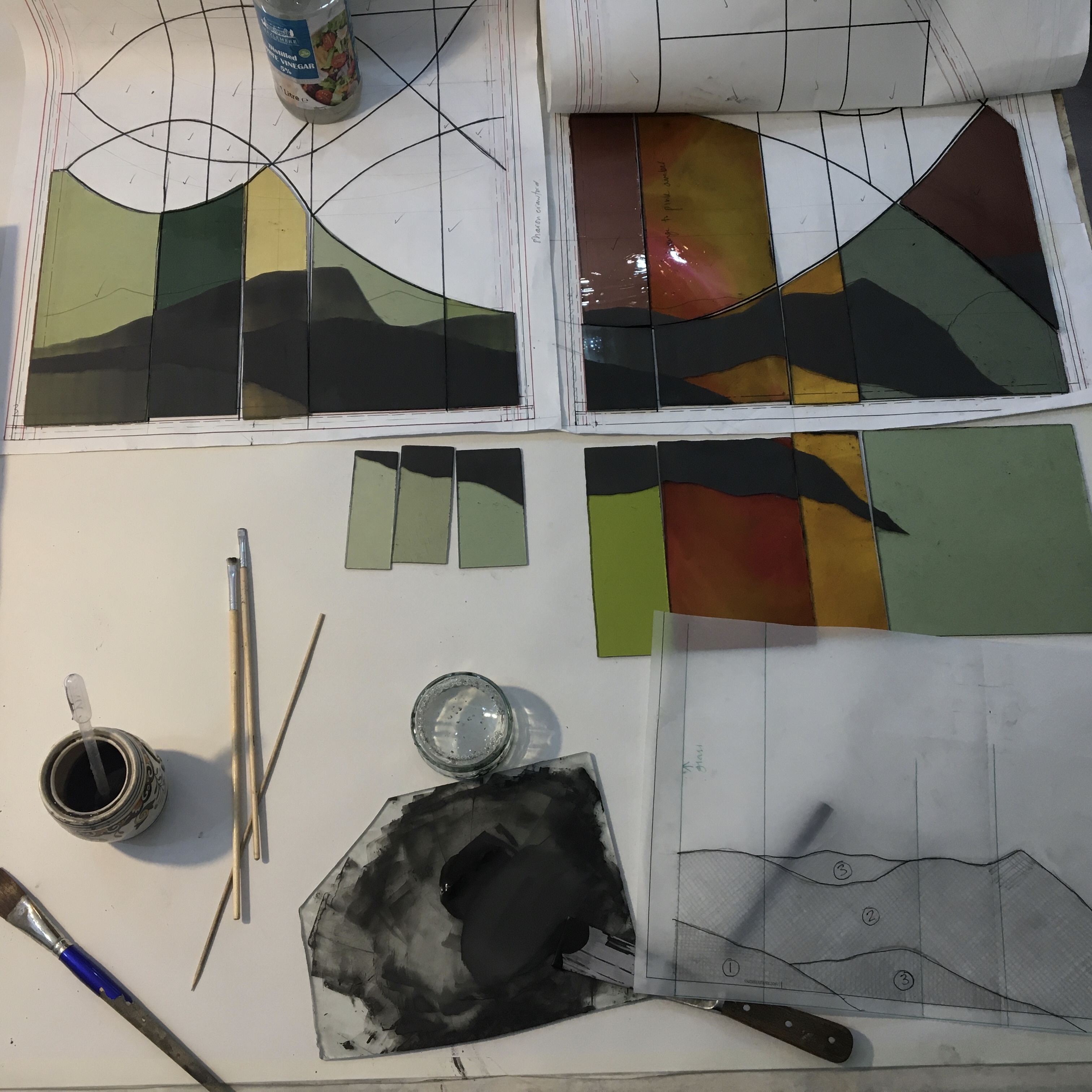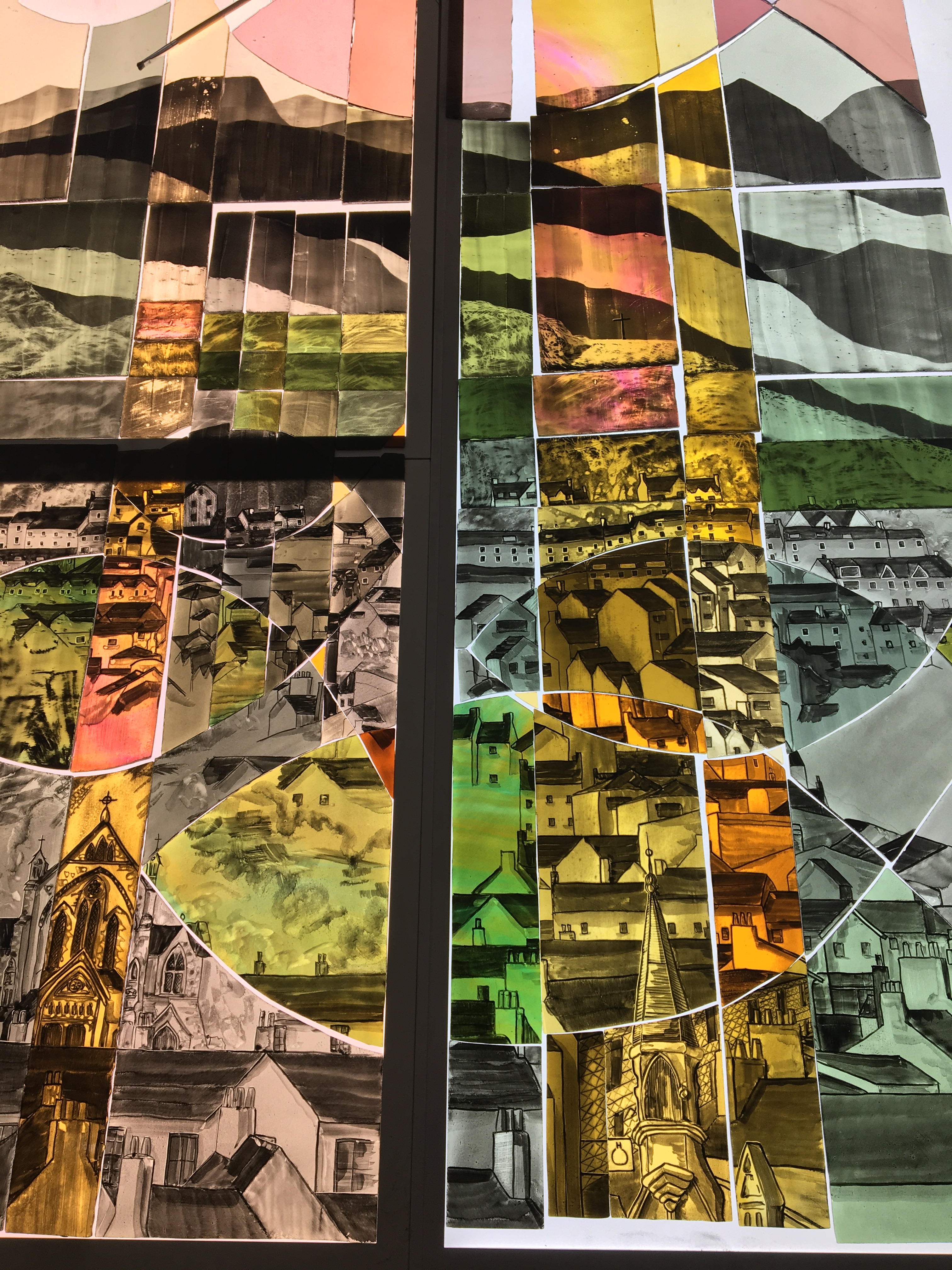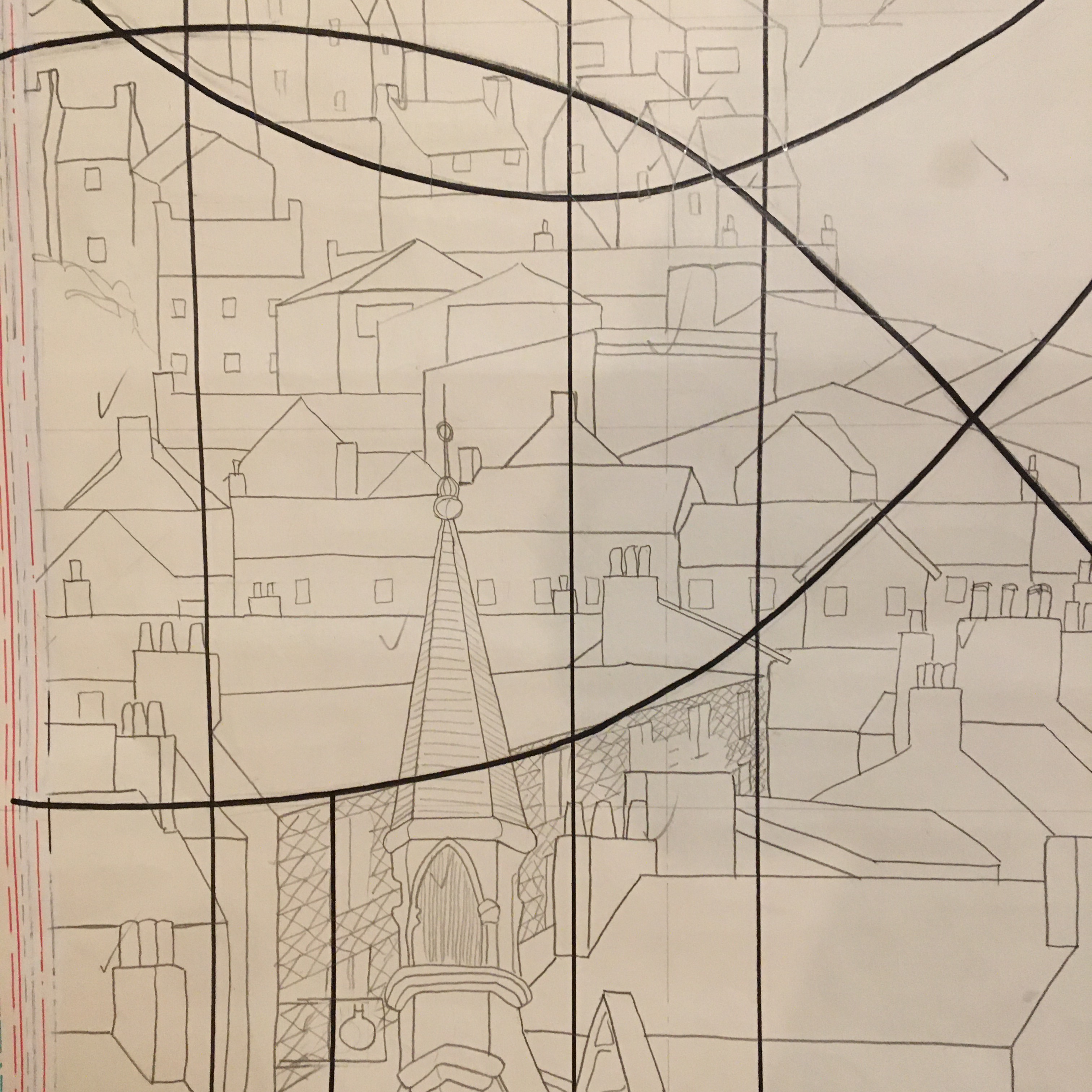 And so I drew and drew that roofscape townscape for my church window. Stood back and drew again. Refining until… until I was happy with how it inched its way up the hill in the real imagined way of Kendal, and until I was just too itching to hit the paint. And paint on that lovely glass. (I have a deadline after all!)