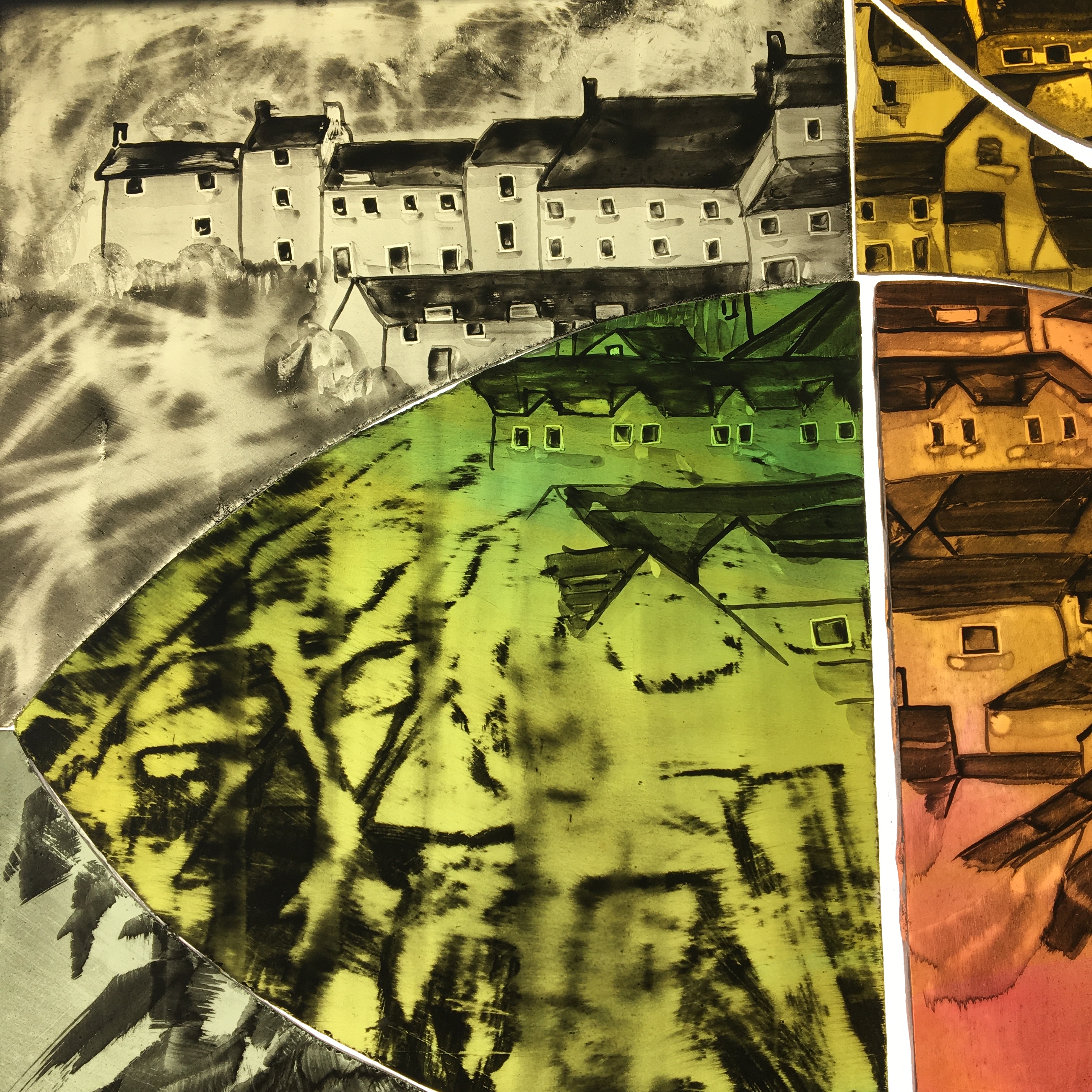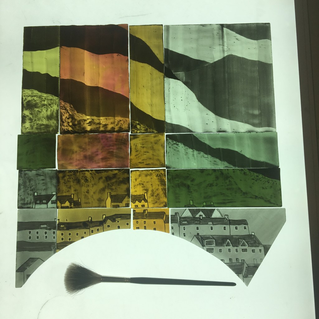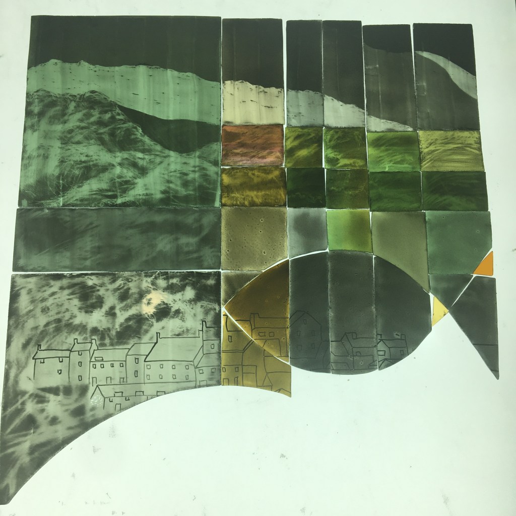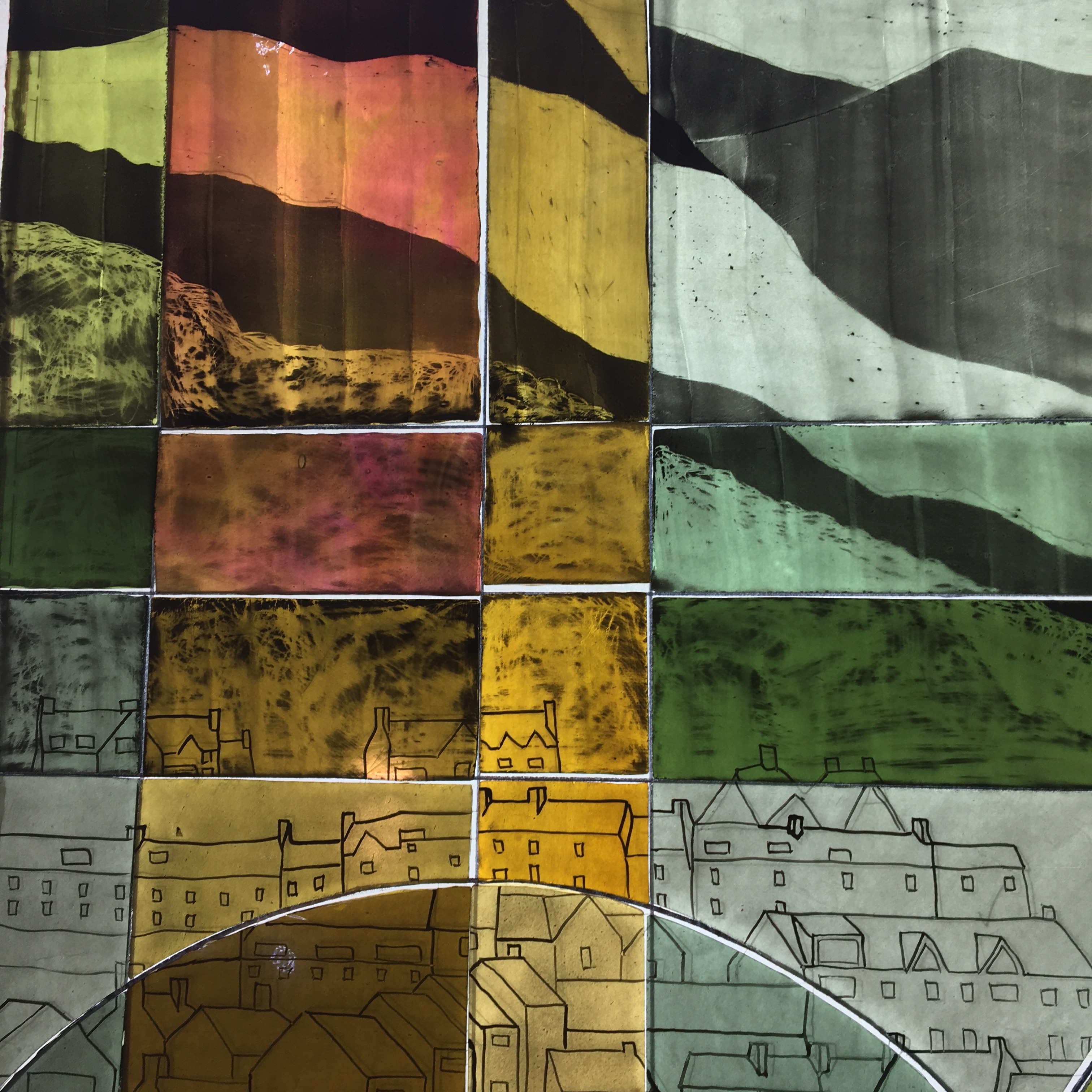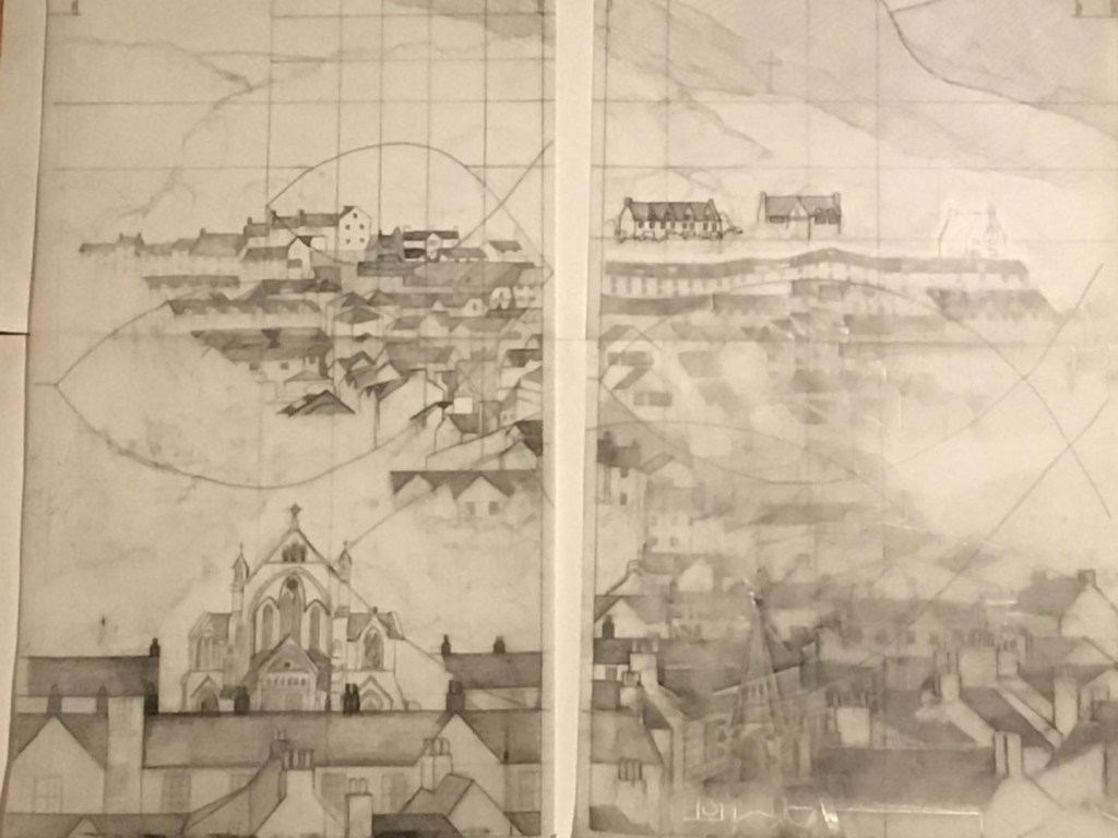 And so I drew and drew that roofscape townscape for my church window. Stood back and drew again. Refining until… until I was happy with how it inched its way up the hill in the real imagined way of Kendal, and until I was just too itching to hit the paint. And paint on that lovely glass. (I have a deadline after all!)