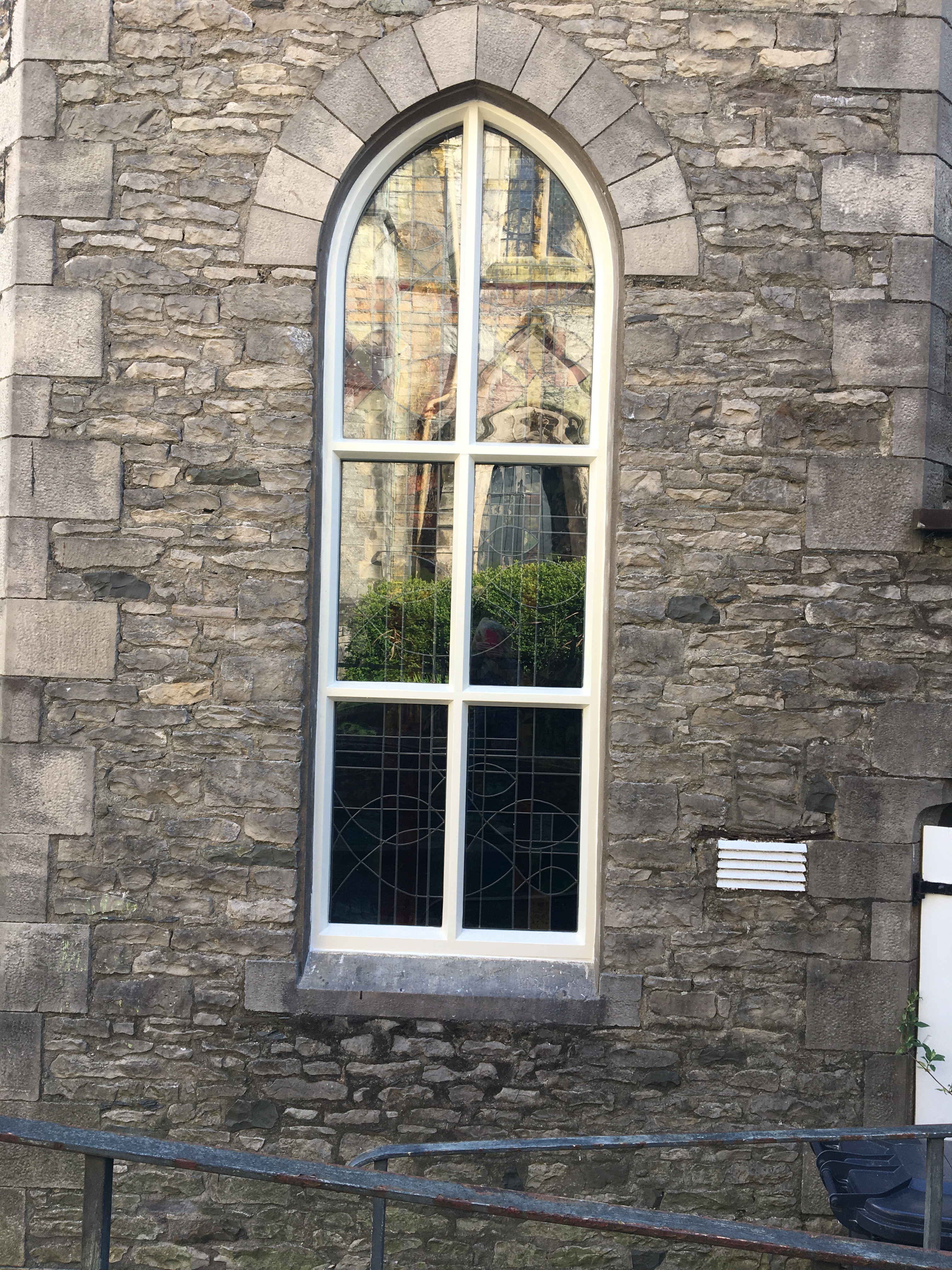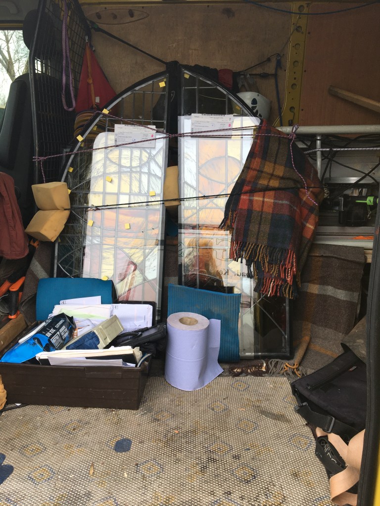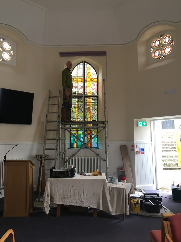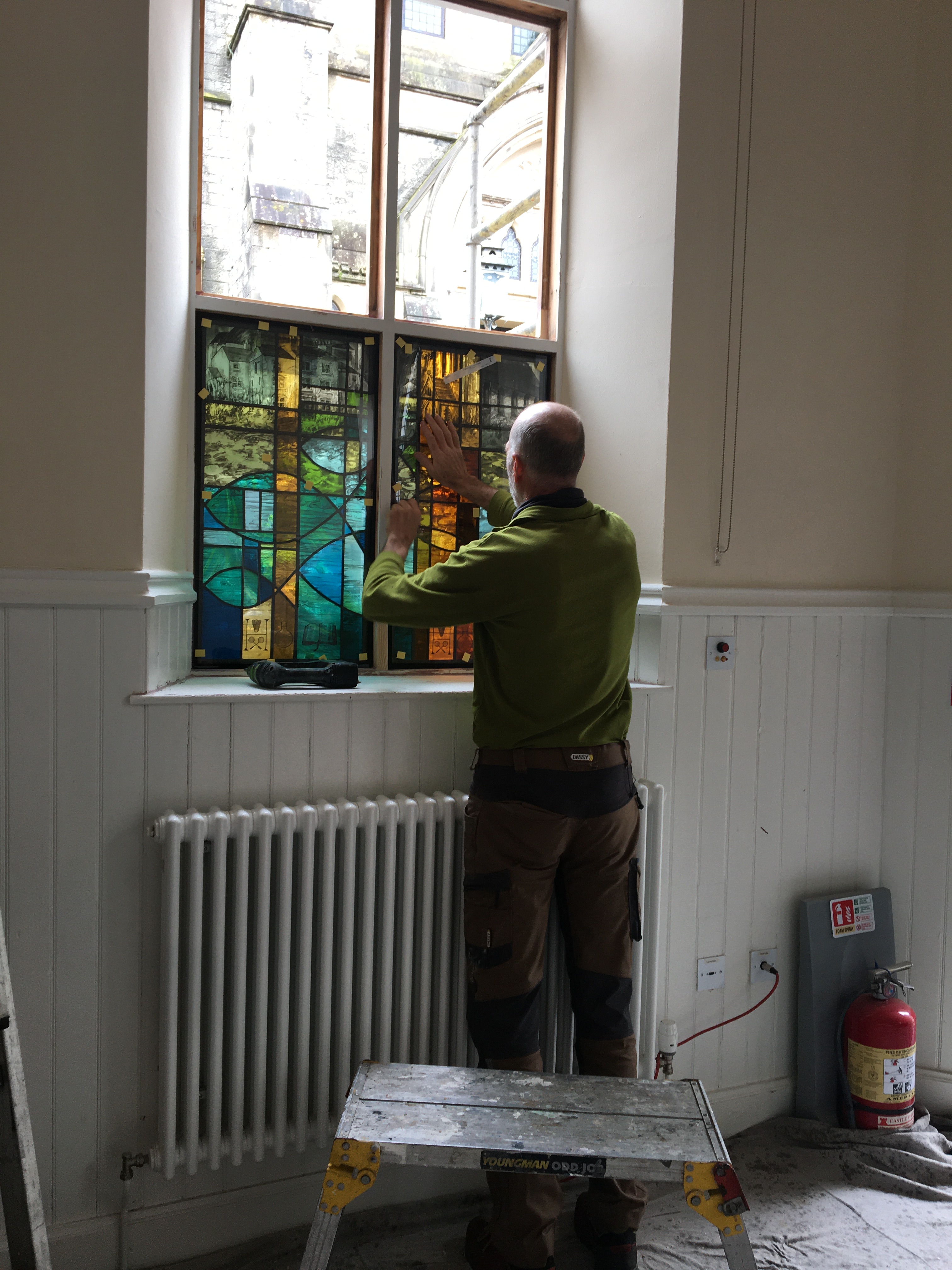 At the end of April my brother, Duncan Copley, began preparing the window. It needed some rotten areas sorting out, the beadings trimming to accommodate the deeper units and redecorating. We were lucky with the weather. Fitting them, watching them go in, and take shape was a grand day.