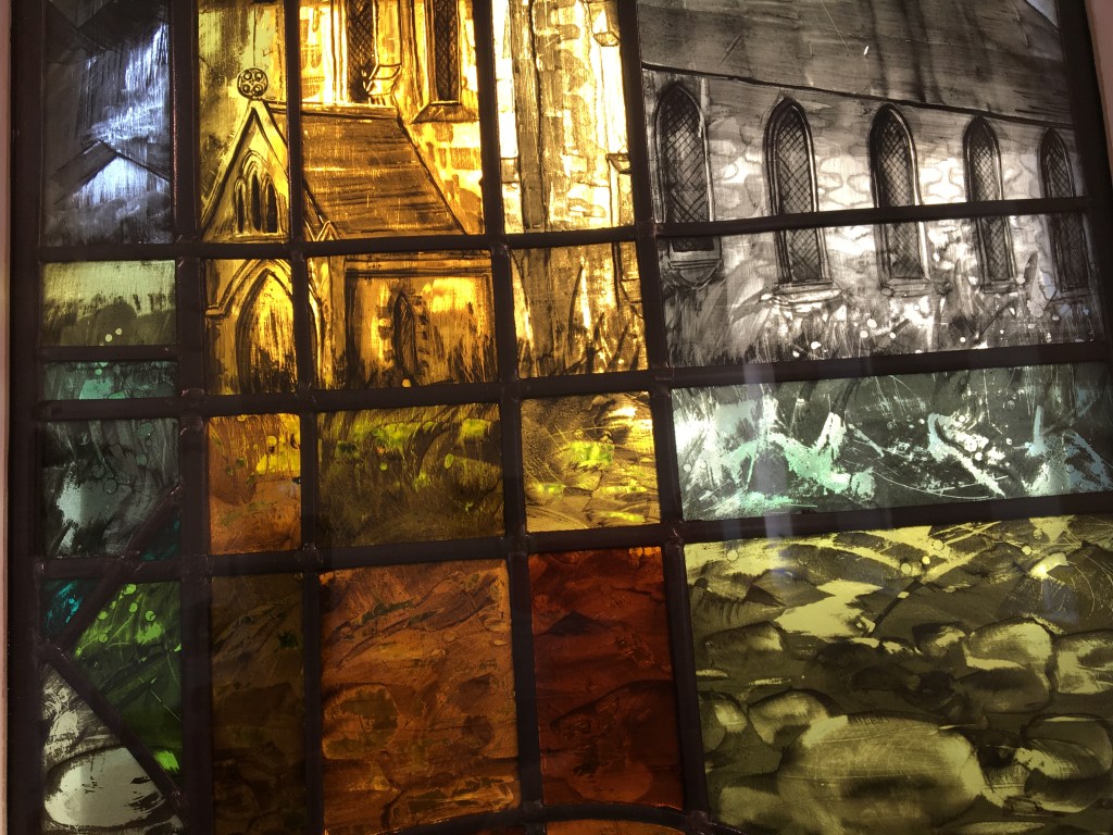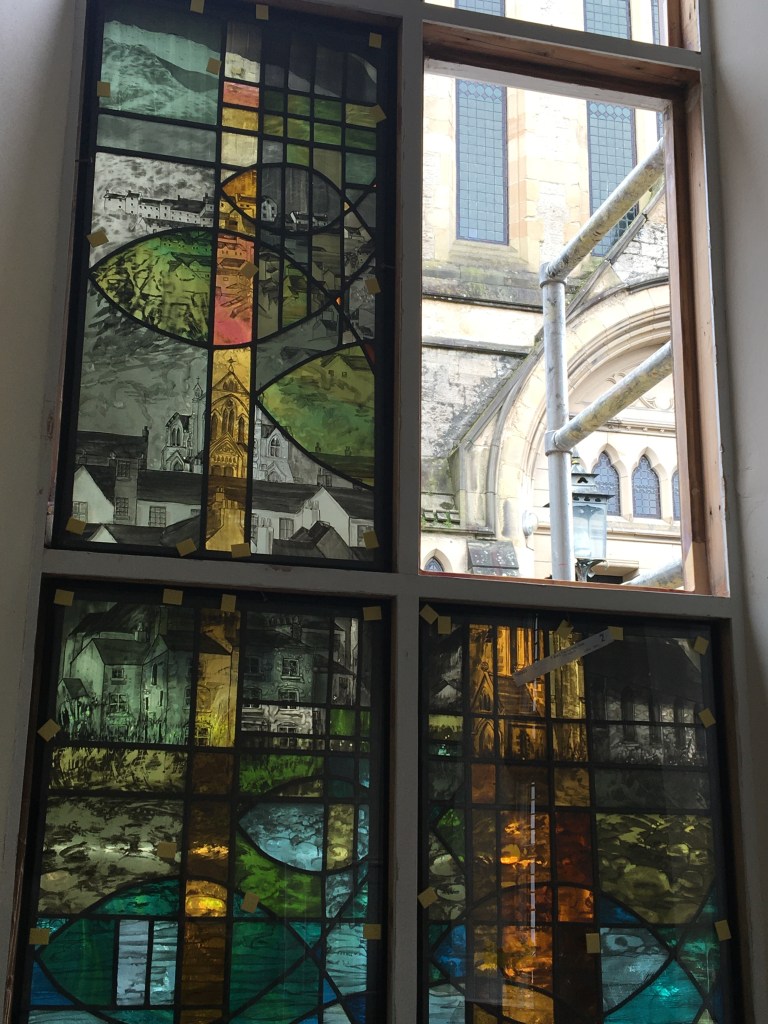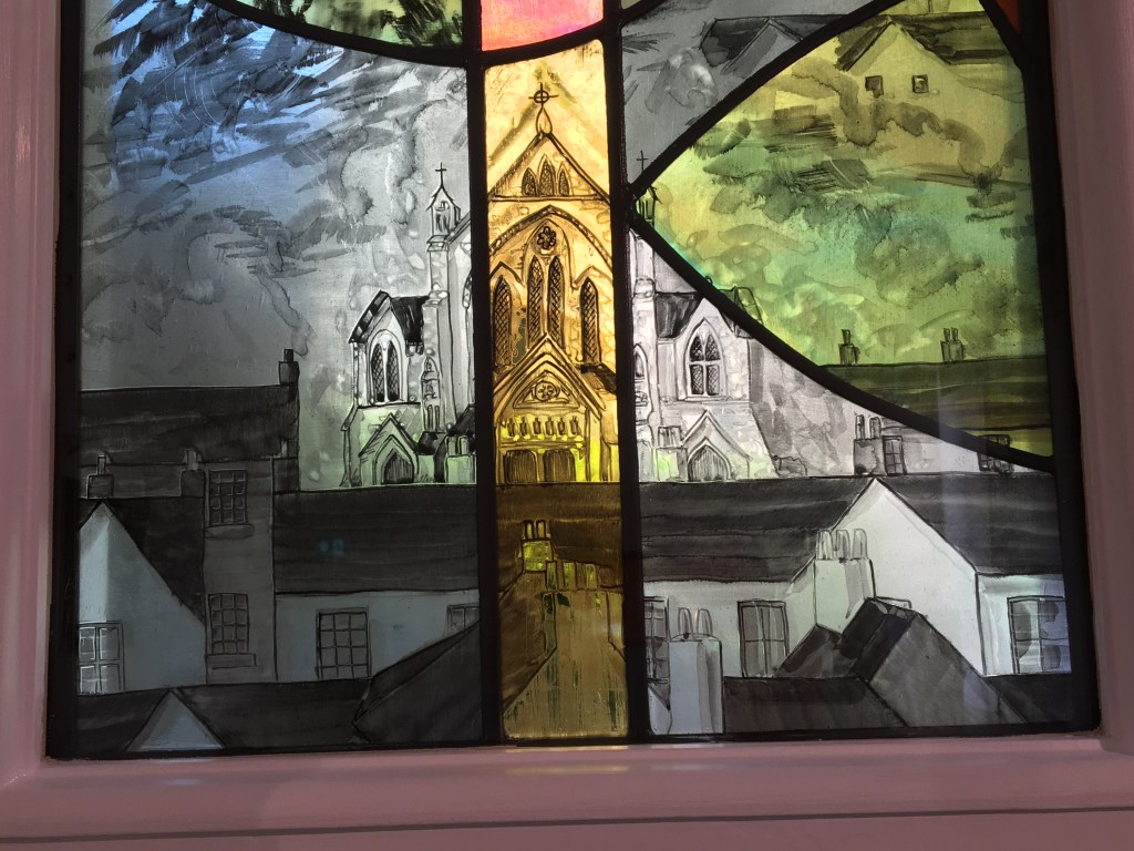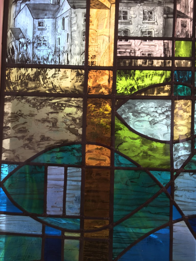 That lovely Kendal townscape as a backdrop to that tapestry of colour…And the detail i was really pleased with, (thanks to the skills learnt on my glass course at Swansea with Jonathan Cooke)… was how i held the light using a final oil layer of paint on the townscape outside of the golden cross. (I worried in the workshop that I had made the old town too dark. But that isn’t the case) The golden cross with its lighter more transparent areas of paint just glows like a strong shaft of light, right down through the window. And the grey areas sit beautiful and flat in comparison.