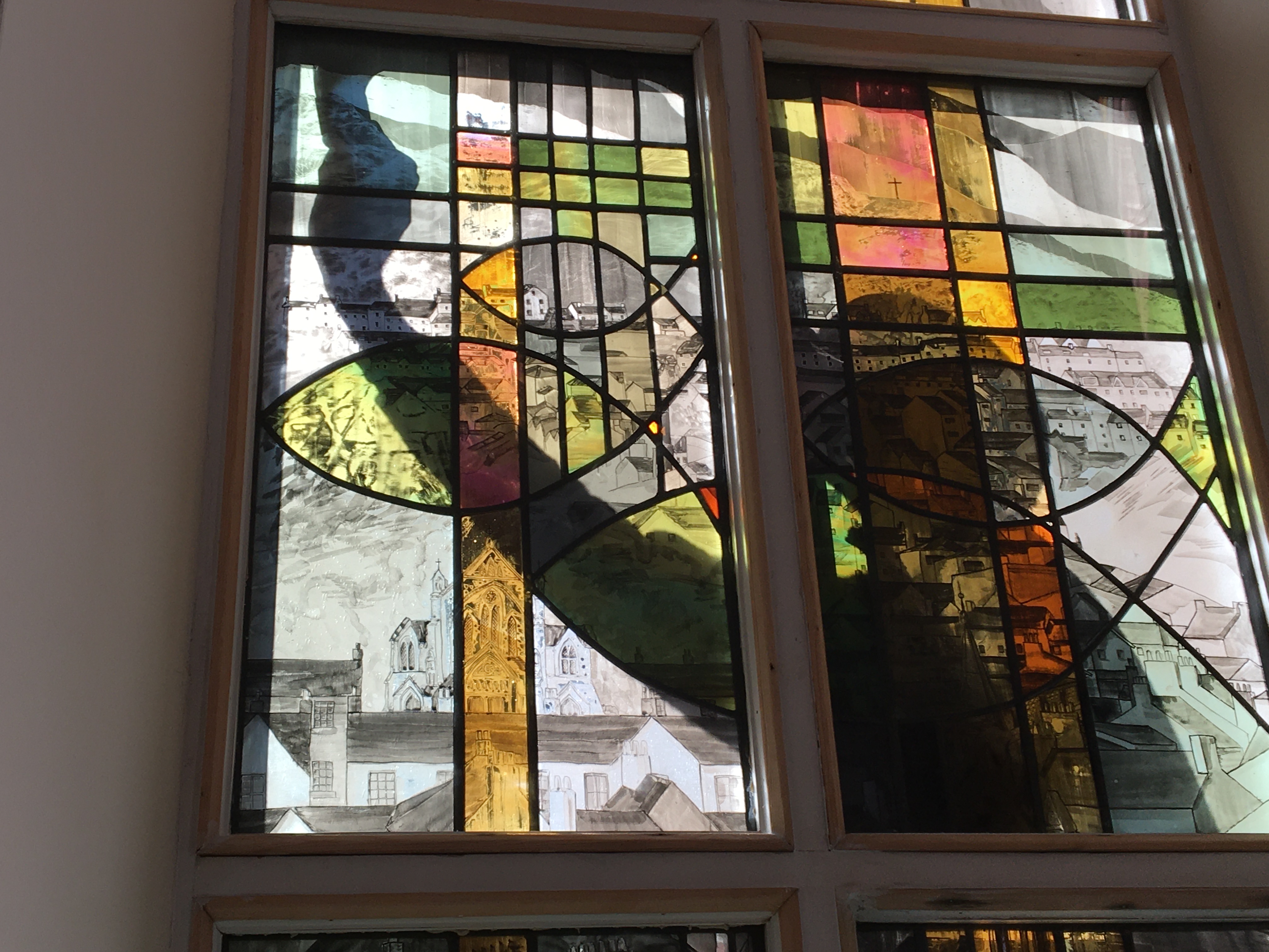 There are two churches pictured in the window and both were important buildings in the spiritual lives of Alan and Rita. The lower right is the Presbyterian church which no longer exists and that once stood on Sandes Avenue. The other, middle left is the old United Reformed Church and if you look through the transparent top reaches of this new window you can catch a glimpse of the old church architecture for real.