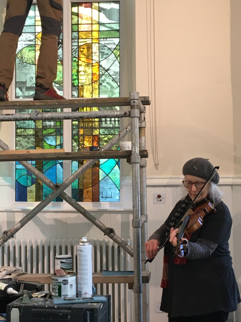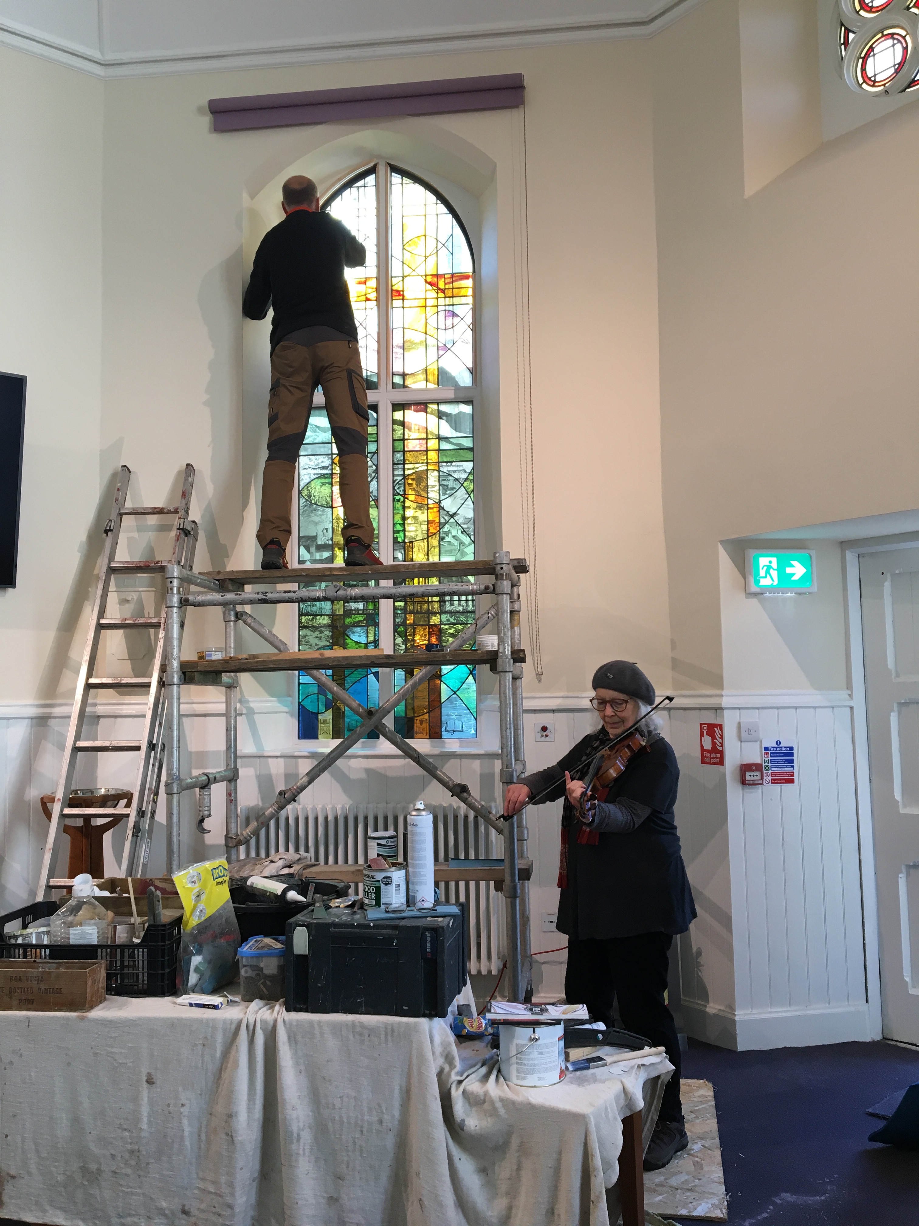 We startled the reverend who had come in to ‘count the chairs’! And every now and then someone else would come and pop their head in…. the guy from the bible shop… the lady who had leant me the tea towel.. (to inform some of my painting detail of the presbyterian old church)…it was really great. A new friend even came and played her fiddle…”I want to play a tune for your window” she said.
