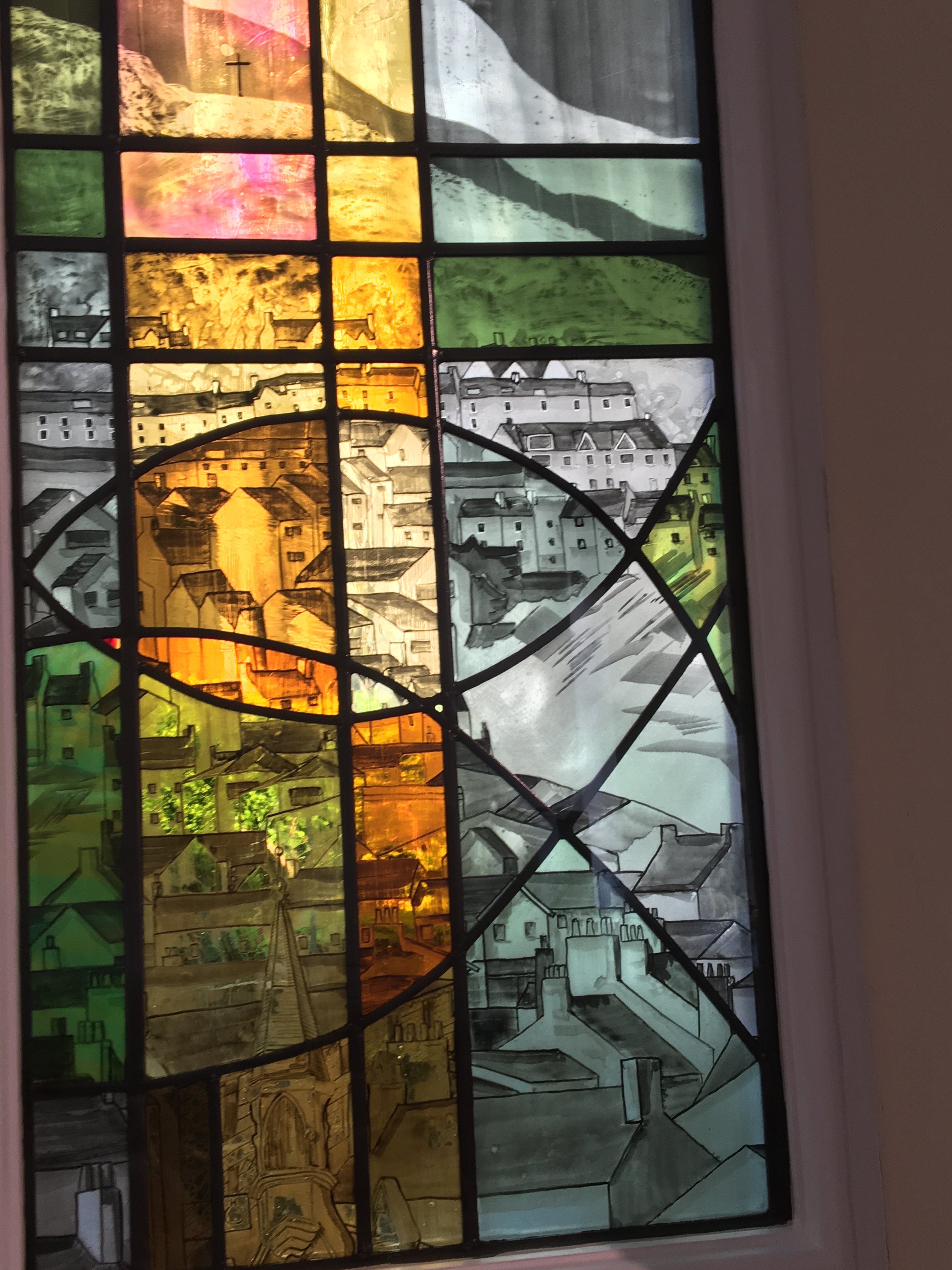 The small cross on the hill, up above the houses, is from the artists imagination. And was placed there purely as acknowledgement of the great sense of importance she felt for this symbol from the congregation at 106 Highgate, as she was creating the window.