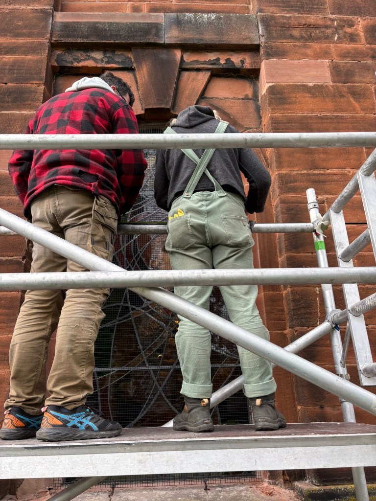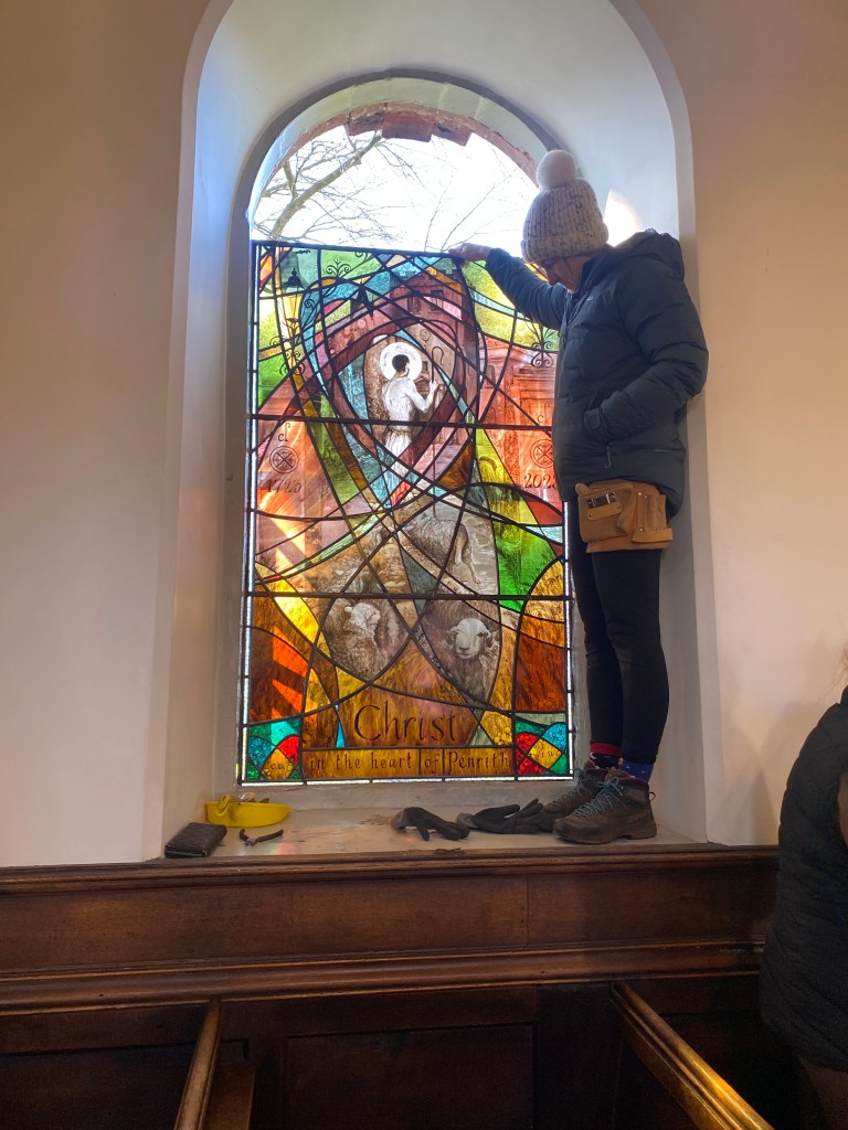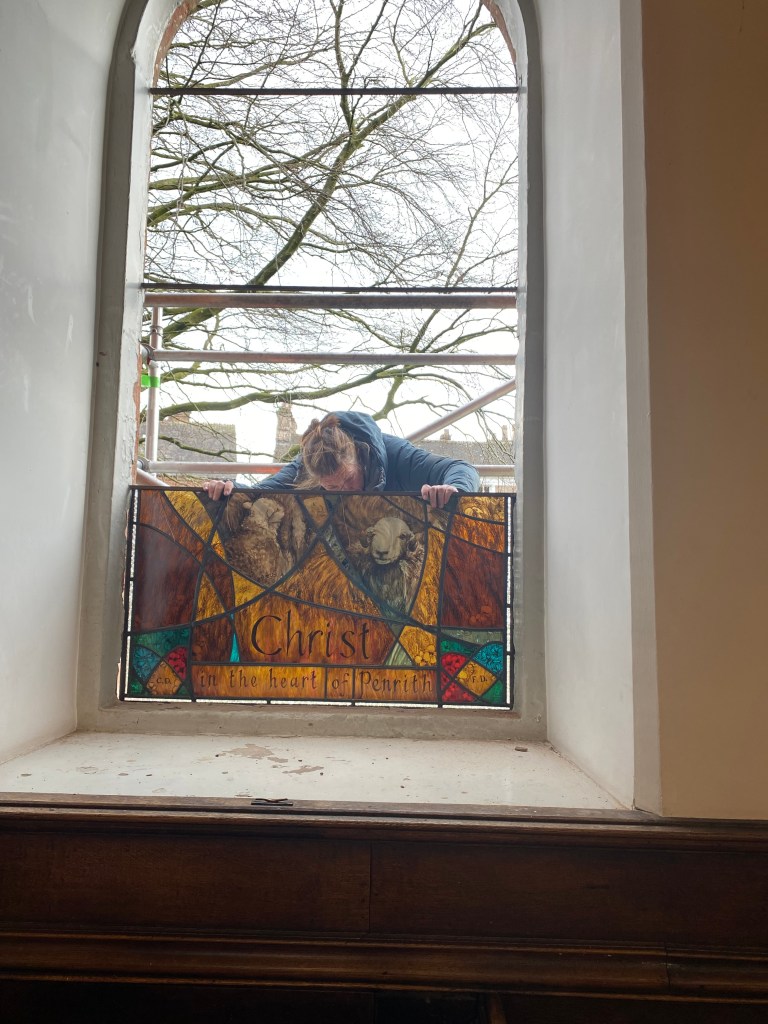So… came the day. Days only before Easter. And very carefully the panels were stowed in Peter’s van (of Cumbria Stained Glass) and we made the journey to Penrith. A nail biting journey… WILL IT FIT? (The phrase that screams in every glass makers head on fitting day).