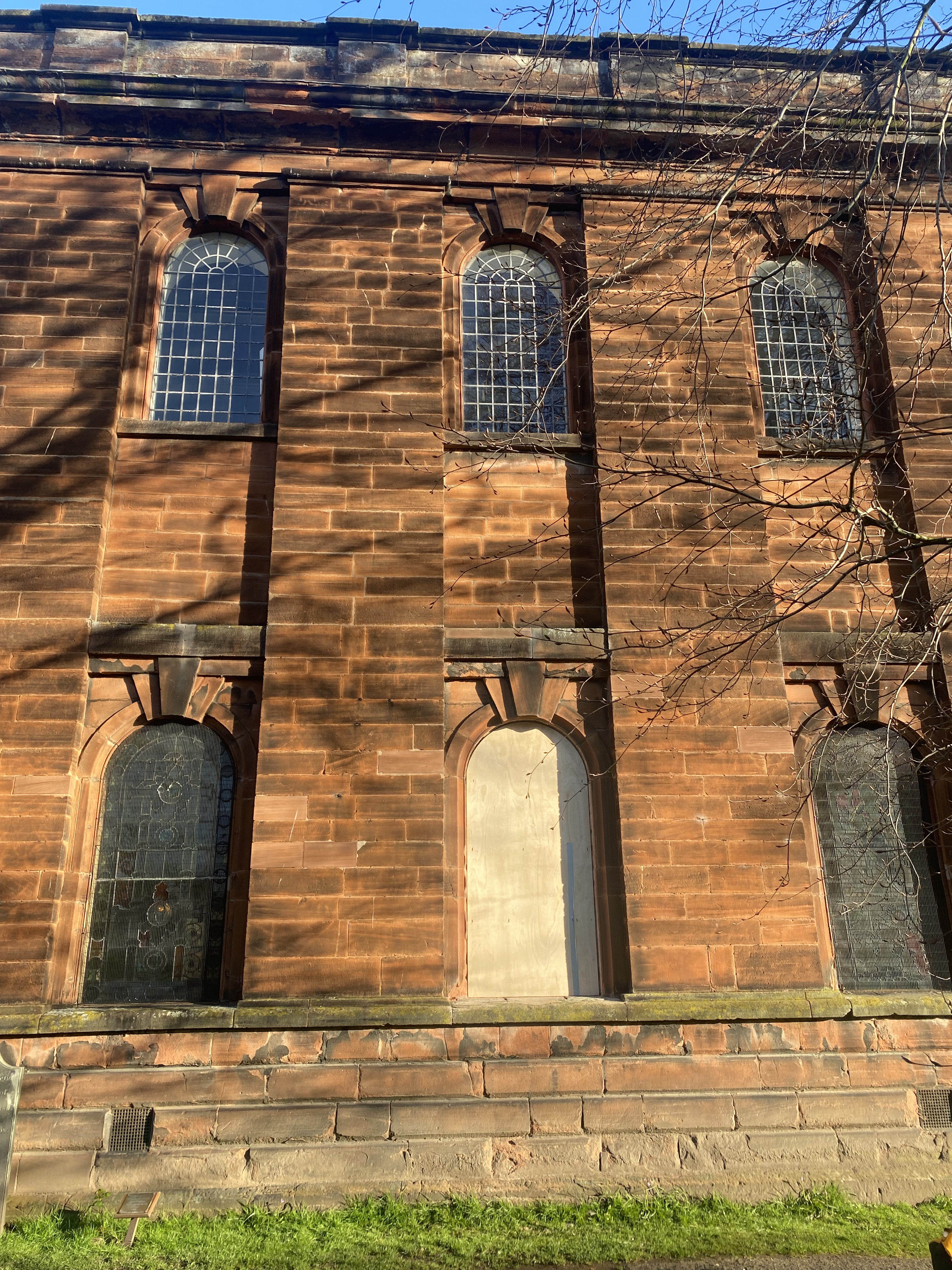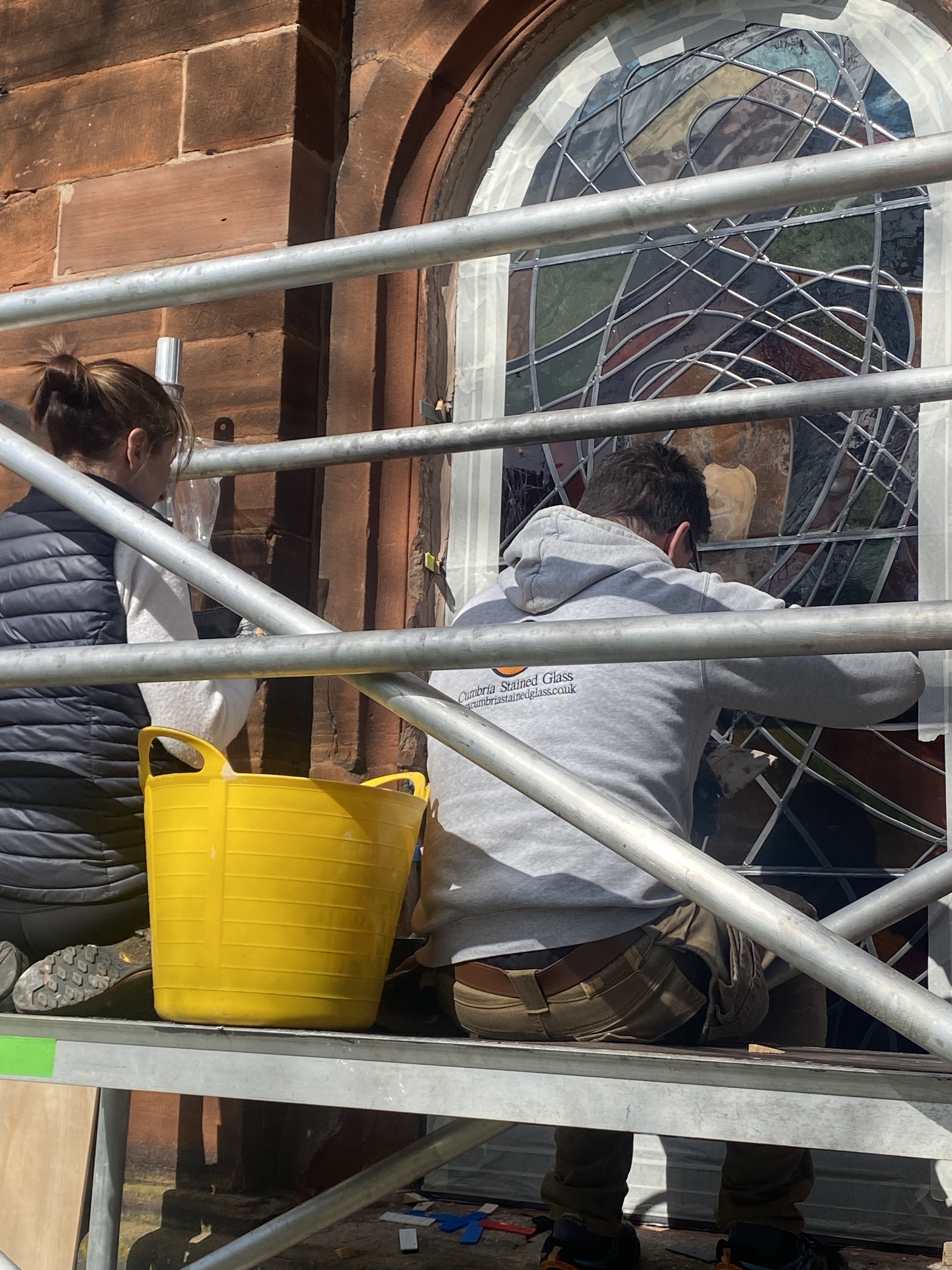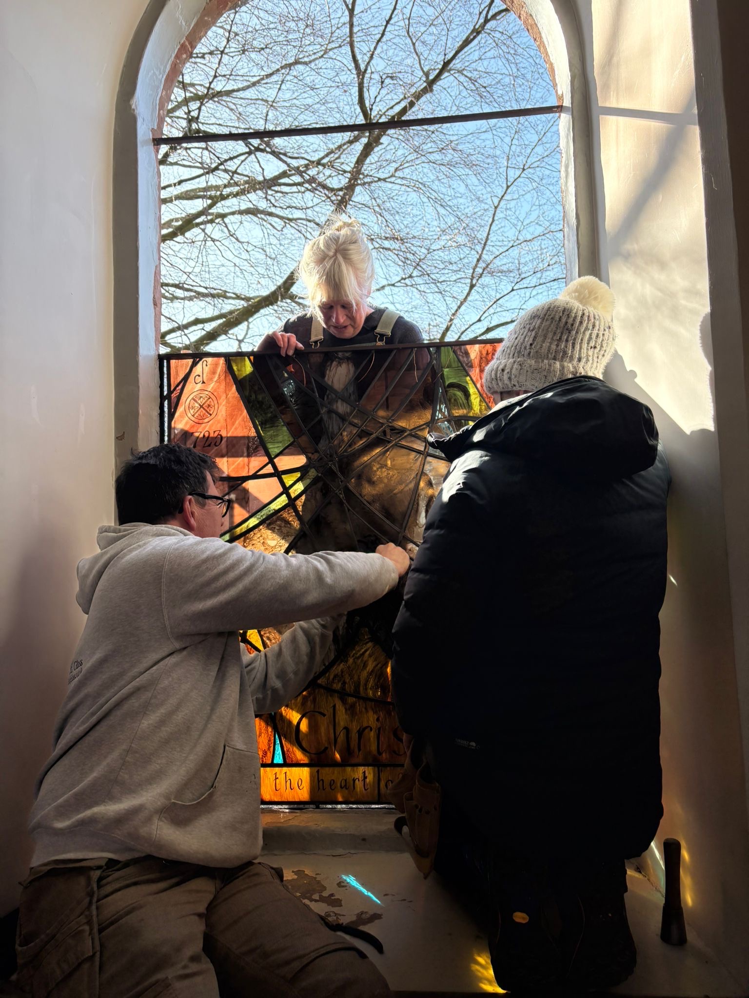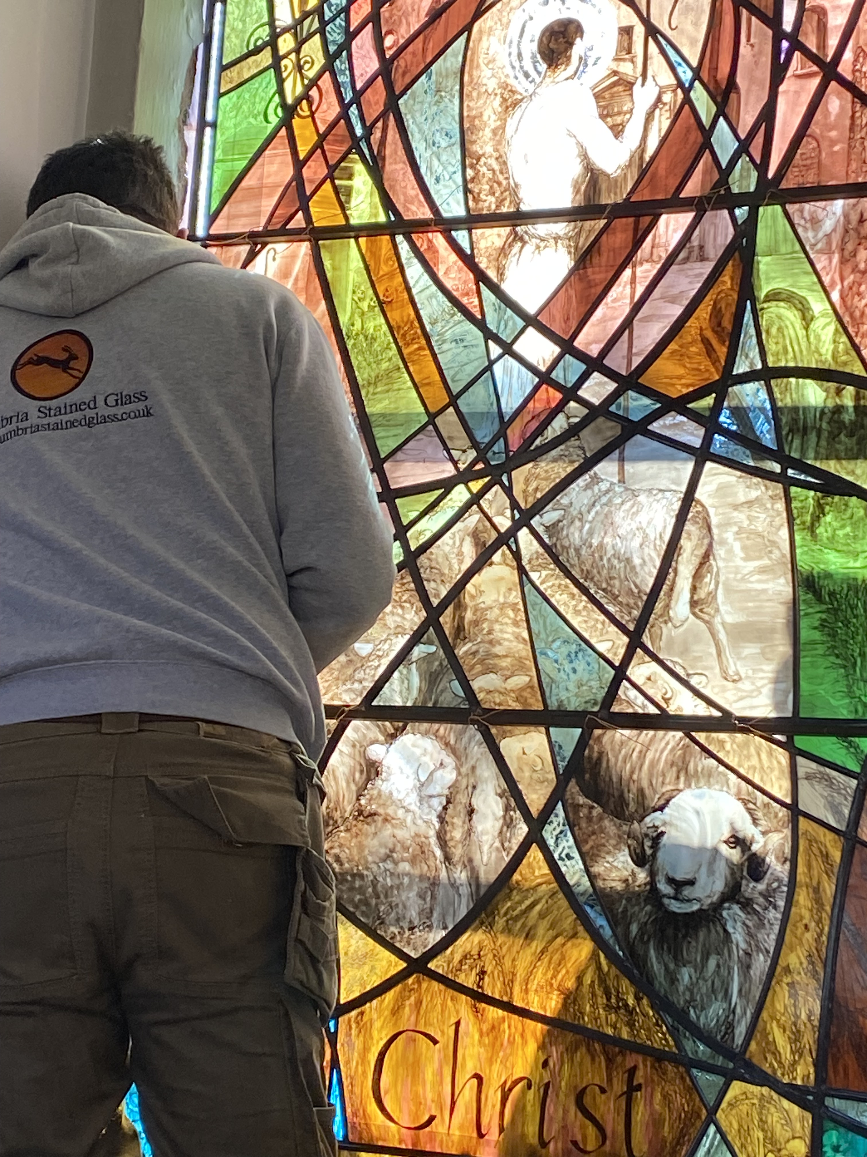 So… came the day. Days only before Easter. And very carefully the panels were stowed in Peter’s van (of Cumbria Stained Glass) and we made the journey to Penrith. A nail biting journey… WILL IT FIT? (The phrase that screams in every glass makers head on fitting day).